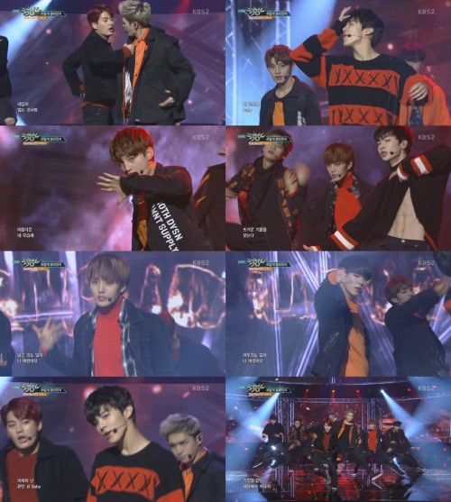 이날 업텐션은 블랙과 오렌지 포인트가 돋보이는 의상을 입고 강렬한 눈빛으로 카리스마 있는 무대를 꾸몄다. 처음부터 끝까지 긴박감과 박력 넘치는 업텐션의 대형 퍼포먼스로 단번에 시선을 집중 시켰다.