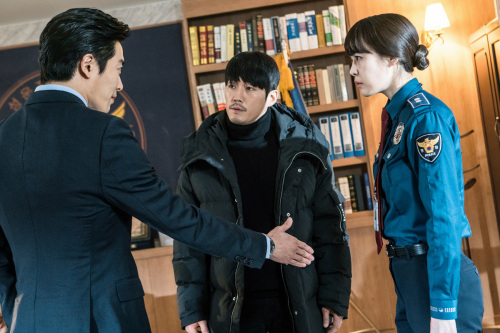 그간 무진혁과 강권주는 일련의 사건들을 통해 점차 남상태(김뢰하), 모태구와 가까워지기 시작했다. ‘보이스’ 13회에서는 무진혁, 강권주, 모태구 세 사람이 한자리에 모이게 되면서 일촉즉발 긴장감을 선사할 예정이다. 방송에 앞서 공개된 사진을 살펴보면 세 사람의 첫 만남에 더욱 귀추가 주목된다. 여유로운 미소를 지으며 악수를 청하고 있는 모태구의 모습과 그에 대비되는 무진혁, 강권주의 모습이 눈길을 끄는 것.
