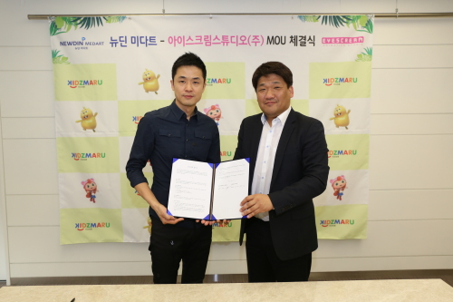 아이스크림스튜디오의 최병선 대표(왼쪽)와 뉴딘미다트 김민광 대표가 업무협약식을 마친 뒤 기념촬영하고 있다.