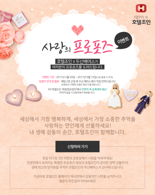 특히 '호텔조인'은 2017 시즌 두산 홈경기 시 전광판 대표 이벤트인 ‘사랑의 프러포즈’의 네이밍 권리를 얻고 행사의 메인 스폰서로 참여한다. ‘호텔조인 사랑의 프러포즈’는 구단과 ‘호텔조인’ 홈페이지 게시판을 통해 접수가 가능하며, 프러포즈 이벤트에 선정된 고객에게는 ‘호텔조인’에서 후원하는 호텔 식사권 등의 푸짐한 경품을 제공한다.