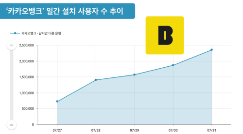 6일 모바일 시장 분석 서비스 앱에이프(App Ape)에 따르면, 카카오뱅크의 일간 신규 설치 수는 앱 시판일인 7월 27일 가장 높게 나타나 약 80만 회에 달했다. 또 하루에 1회 이상 앱을 실행하는 유저수(DAU)는 처음 월요일을 맞이한 7월 31일에 가장 높아 약 112만 명이었다. 또 30대와 40대 남성 및 30대 여성에게 큰 호응을 얻고 있는 것으로 분석됐다
