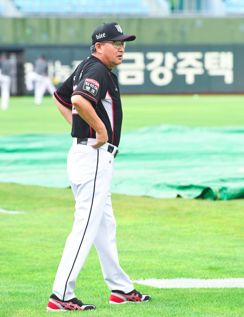 kt는 좀 더 여유 있는 모양새다. 경기 시작을 약 90분 남겨둔 시점, 하늘에서 계속 비가 떨어지고 있는 와중에도 전날 나온 경기 라인업을 기록지에 옮겨적으며 여느 때와 마찬가지로 경기를 준비하고 있었다. “어차피 경기를 하느냐 마느냐의 여부는 내가 정하는 게 아니지 않나”라던 김진욱 kt 감독은 “만약 진행될 거라면 지금이라도 비가 좀 그쳐야 그라운드를 정비할 수 있을 것 같다”라고 바라봤다.