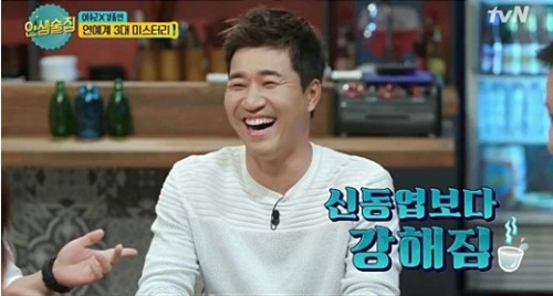 신동엽은 18일 방송된 tvN '인생술집'에서 김종민이 여자가 없으면 술을 안 먹는다는 말에 "내가 잘 안다. 나랑 있을 때 안마시다가 여자 연예인이 오면 술이 나보다 세진다"고 말해 웃음을 자아냈다. 그러자 김종민은 "평소 주량이 맥주 두 캔 정도다. 남자끼리 마시면 두 캔 마시고 집에 간다"고 너스레를 떨어 다시 한번 폭소를 자아냈다.