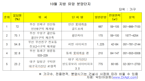 지방 유망 분양단지는 상위 1~4위를 모두 부산이 차지했다. 부산시 연제구 연산6구역을 재개발하는 연산 롯데캐슬 골드포레가 응답율(3개 복수응답) 72%로 1위에 올랐다.