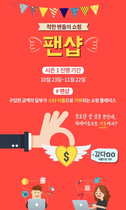 이번에 새롭게 선보이는 팬샵은 쇼핑도 즐기면서 내가 좋아하는 스타의 이름으로 기부도 할 수 있는 쇼핑 플레이스. 긍정적인 팬문화 형성과 스타 커뮤니티 교류 활성화를 위해 시즌제로 운영될 예정이다. 시즌1은 오는 22일까지 진행되며, 기부금은 생존 일본군 위안부 할머니 후원시설인 ‘나눔의 집’에 전액 기부된다.