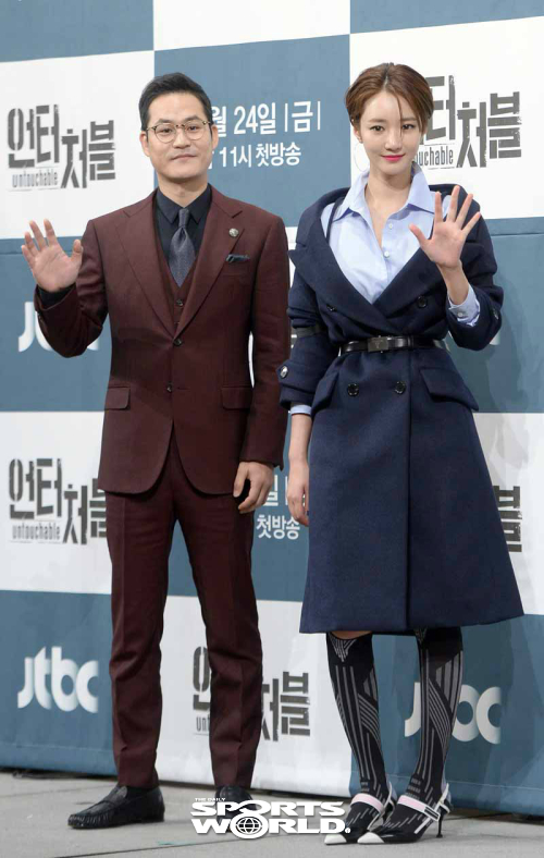 [스포츠월드 김두홍 기자] 배우 김성균(왼쪽)과 고준희가 21일 논현동 임피리얼팰리스호텔에서 열린 jtbc 금토드라마 '언터쳐블' 제작발표회에서 포즈를 취하고 있다.