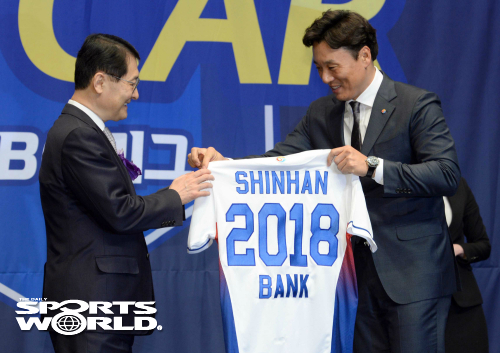 [스포츠월드 김용학 기자] 이승엽 한국야구위원회 홍보대사(오른쪽)가 16일 신라호텔 다이너스티홀에서 열린 'KBO리그 타이틀스폰서 조인식'에서 위성호 신한은행장에게 기념 유니폼을 전달하고 있다.