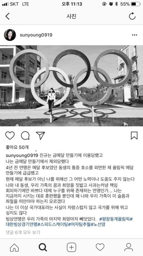 노선영은 24일 자신의 SNS를 통해 “진규는 금메달 만들기에 이용당했고, 나는 금메달 만들기에서 제외 당했다”고 입을 열었다. 이어 노선영은 “4년 전 연맹은 메달 후보였던 동생의 통증 호소를 외면한 채 올림픽 메달 만들기에 급급했고, 현재 메달 후보가 아닌 나를 위해선 그 어떤 노력이나 도움도 주지 않는다”고 분노했다. 그러면서 “나와 내 동생, 우리 가족의 꿈과 희망을 짓밟고 사과는커녕 책임 회피하기에만 바쁘다. 대체 누구를 위해 존재하는 연맹인가. 나는 지금까지 시키는 대로 훈련했을 뿐인데, 왜 나와 우리 가족이 이 슬픔과 좌절을 떠안아야 하는지 모르겠다. 나는 더 이상 국가대표라는 사실이 자랑스럽지 않고, 국가를 위해 뛰고 싶지도 않다”고 덧붙였다.