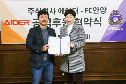 지난 26일 오후, (주)에이더와 FC안양과의 후원 협약이 FC안양 임은주 단장, ㈜에이더 황윤진 대표 등 양 사 관계자들이 참석한 가운데 진행됐다. (주)에이더는 가치있는 제품으로 1억명이 넘는 사람들의 건강한 활동에 도움을 주는 브랜드로서 손목, 발목, 무릎, 허리, 발 보호대 등을 제작한다.