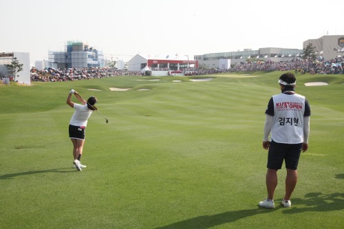 지난해 대회에서 김지현의 마지막 18번홀 샷 장면.