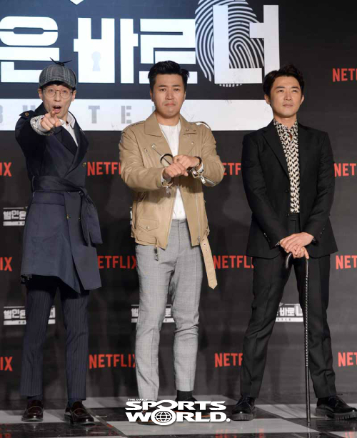 [스포츠월드 김두홍 기자] 유재석, 김종민, 안재욱(왼쪽부터)이 30일 삼성동 인터컨티넨탈 서울 코엑스 하모니볼룸에서 열린 넷플릭스'범인은 바로 너'제작발표회에서 포즈를 취하고 있다.