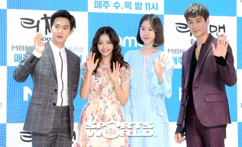 [스포츠월드 김두홍 기자] 배우 김준면, 하연수, 김예원, 오창석(왼쪽부터)이 3일 용산 드레곤시티 스카이킹덤에서 열린 MBN 수목드라마'리치맨' 제작발표회에서 포즈를 취하고 있다.