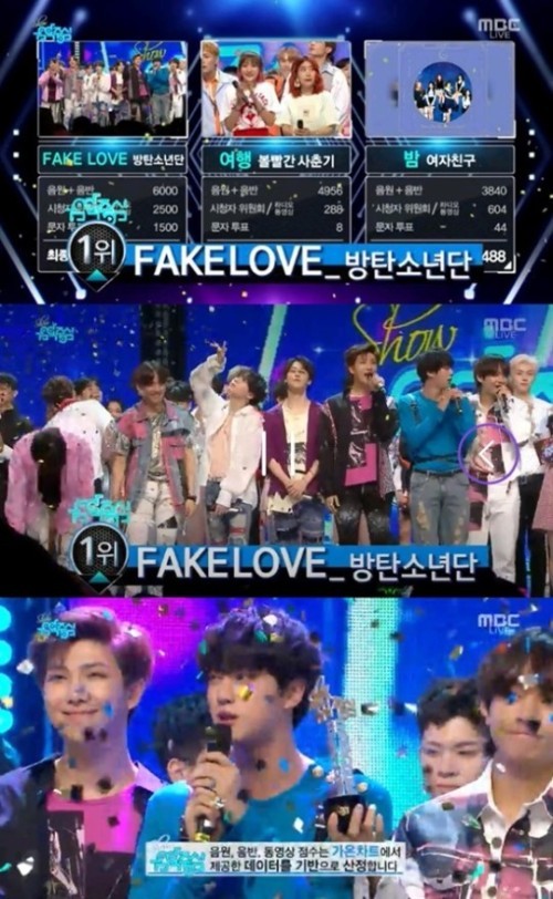 방탄소년단의 ‘페이크 러브(FAKE LOVE)’는 2일 방송된 MBC ‘쇼! 음악중심’에서 또 한 번 만점을 기록, 함께 후보에 오른 볼빨간 사춘기의 ‘여행’과 여자친구 ‘밤’을 제치고 정상에 올랐다. 결과가 발표된 후 방탄소년단은 “만점을 받게 해주셔서 감사하다”고 감격스러워하며 “우리 아미, 좋은 일이 있을 때나, 슬픈 일이 있을 때 함께 해주셔서 감사하다. 앞으로도 함께하자”고 팬들에게 고마움을 표했다.