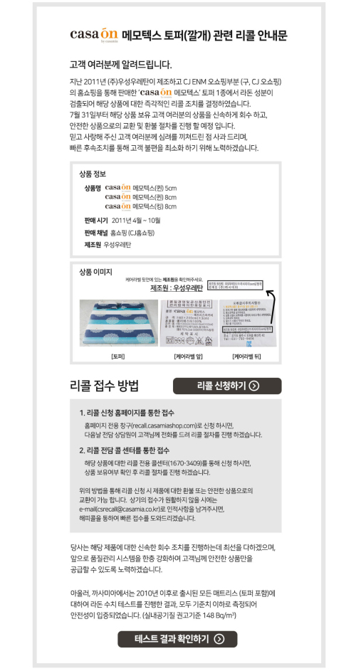 원안위는 업체가 제공한 13개의 시료 중 토퍼 2개와 베개 1개 등에서 연간 피폭선량이 1mSv를 초과한 것을 확인했다. 이번에 안전기준을 초과한 것으로 나타난 토퍼 세트의 제품명은 ‘casaon 메모텍스’다. 2011년 4월부터 10일까지 Cj홈쇼핑을 통해 한시적으로 판매한 제품이다. 총 판매량은 1만 2395개 세트다. 까사미아는 결함 제품을 수거하기 위해 전용 콜센터를 운영하며, 제품을 1개월 내 모두 수거하겠다고 밝혔다.
