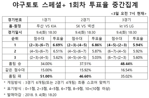체육진흥투표권 스포츠토토의 수탁사업자인 ㈜케이토토는 4일(화)에 열리는 2018시즌 한국프로야구(KBO)프로야구 3경기를 대상으로 한 야구토토 스페셜 플러스 1회차 투표율을 중간 집계한 결과, 야구팬들은 kt-LG(3경기)전에서 홈팀 kt의 근소한 우세를 전망했다고 3일 밝혔다.