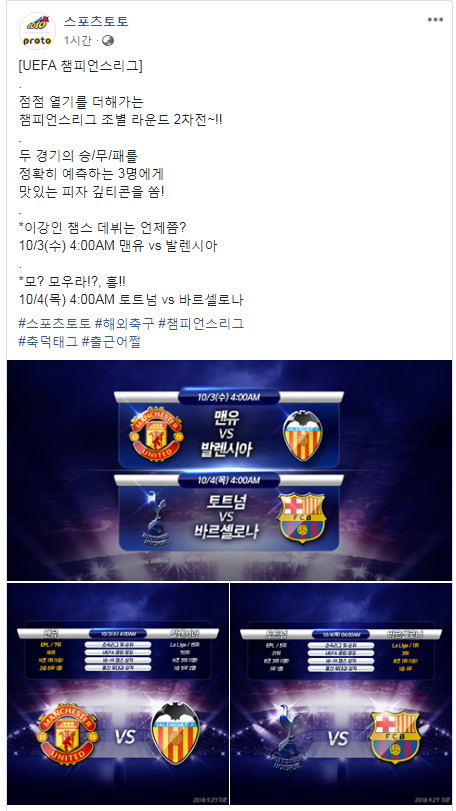 이벤트의 대상 경기는 오는 3일과 4일 오전 4시에 열리는 맨유-발렌시아전과 토트넘-바르셀로나전이며, 페이스북 이벤트 페이지에서는 각 팀의 리그 순위, UEFA 클럽랭킹, 통산 맞대결 성적 등 각종 분석 정보를 제공한다. 더불어 댓글로 결과(승, 무, 패)를 정확히 예측한 3명에게는 추첨을 통해 피자 기프티콘을 증정한다.