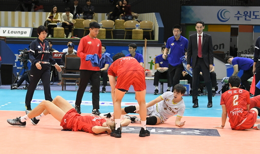 한국전력의 외국인 선수 아텀이 18일 경기도 수원체육관에서 치른 삼성화재와의 ‘도드람 2018~2019 프로배구 V리그’ 남자부 2라운드 홈경기에서 바닥에 쓰러져 있다. / 사진=KOVO