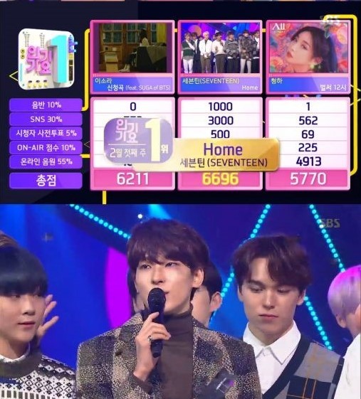 세븐틴은 3일 방송된 SBS '인기가요'에서 신곡 '홈'으로 이소라, 청하를 제치고 1위 트로피를 들어올렸다. 데뷔 후 첫 '인기가요' 1위 수상이라는 점에서 의미가 남달랐다.