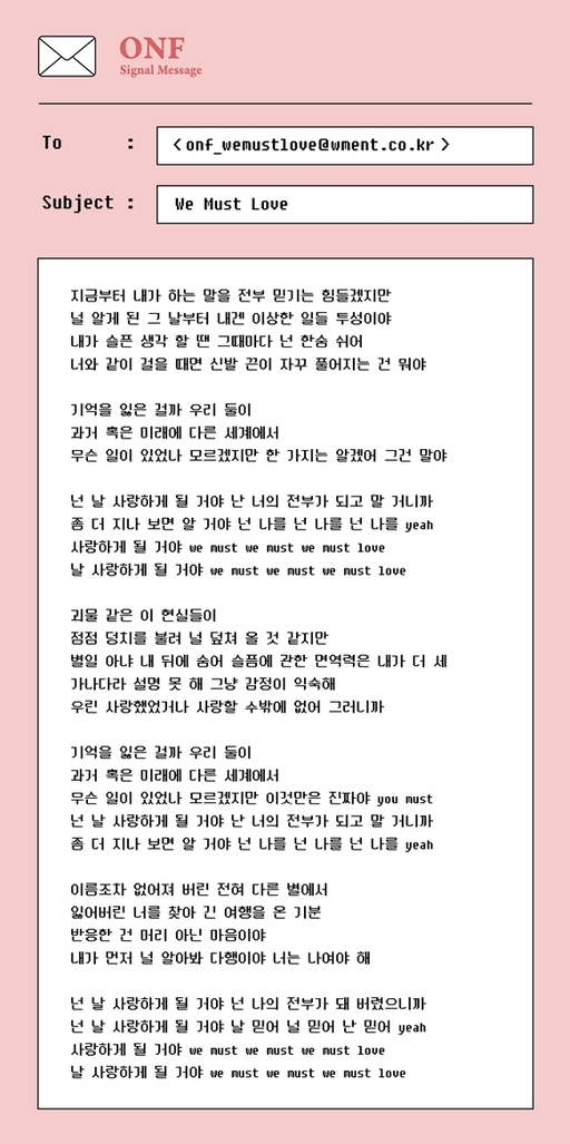 공개된 이미지는 누군가가 온앤오프에게 보내는 이메일처럼 보여지며, 메일 내용에는 신곡 ‘사랑하게 될 거야(We Must Love)’ 가사가 적혀있다. "지금부터 내가 하는 말을 전부 믿기는 힘들겠지만 널 알게 된 그날부터", "기억을 잃은 걸까 우리 둘이". "과거 혹은 미래에 다른 세계에서 무슨 일이 있었나", "이름조차 없어져 버린 전혀 다른 별에서", "잃어버린 너를 찾아 긴 여행을 온 기분", "내가 먼저 널 알아봐 다행이야" 등 서로 다른 시공간에서 우리가 만나기까지의 과정을 마치 한 편의 영화처럼 감각적으로 표현해내며 새 앨범 콘셉트에 대한 궁금증을 증폭시키고 있다.