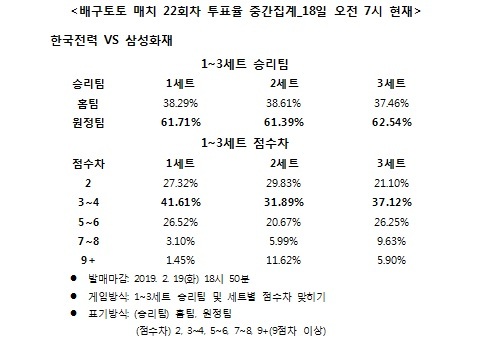 한편, 이번 배구토토 매치 22회차 게임은 19일 오후 6시50분에 발매가 마감되며 경기가 모두 종료된 후에 결과가 공식 발표된다.
