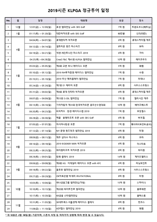 KLPGA는 지난 18일 2019시즌 스케줄을 발표했다. 대회 수 29개, 총상금 약 226억 원, 평균상금 약 7억8000만 원으로, 지난 시즌 대비 1개 대회와 총상금 20억 원이 늘어났다. 총상금 10억 원 이상 대회도 6개로 2개 늘었다.