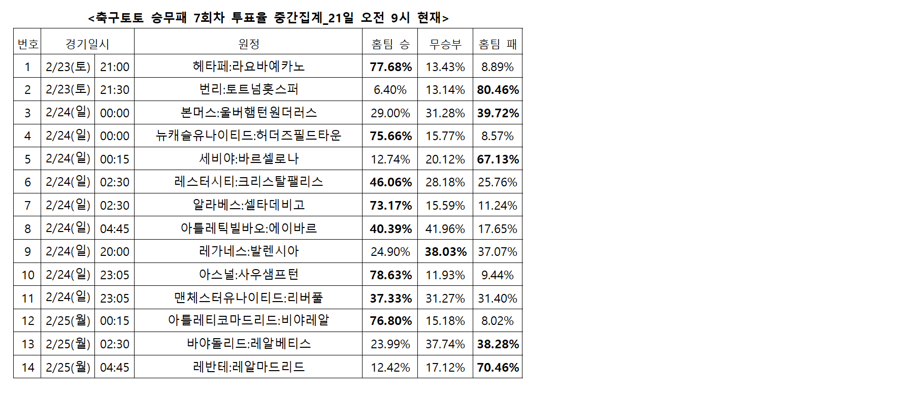 한편, 이번 승무패 7회차는 오는 23일(토) 오후 8시50분에 발매를 마감하며, 경기가 모두 종료된 후에 결과가 공식 발표된다.