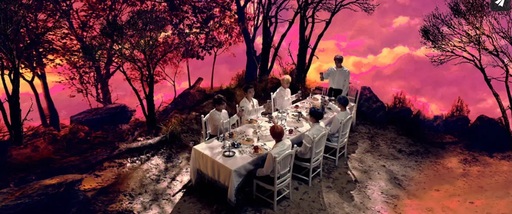 의혹을 제기한 부분은 배경과 연출 구도다. ‘피 땀 눈물’에서는 식탁에 둘러싸여 앉은 방탄소년단의 멤버들이 잔을 든 장면이 나온다. 배경으로는 그림 같이 펼쳐지는 구름이 눈길을 끈다. ‘피 땀 눈물’은 방탄소년단의 대표적인 히트곡으로 4억 뷰의 뮤직비디오 시청 기록을 지니고 있다. 또한 2018년 작인 방탄소년단의 ‘아이돌’ 역시 식탁씬이 등장하기도 한다.