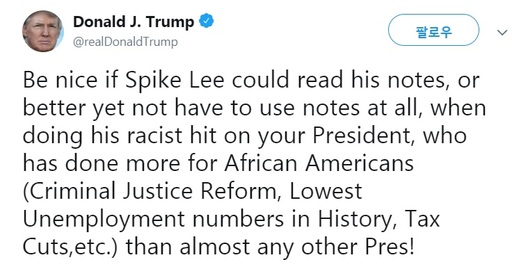 시상식은 끝났지만 가시 돋친 말싸움은 계속되고 있다. 지난 24일 제91회 아카데미 시상식 직후 도널드 트럼프 미국 대통령은 자신의 트위터에 “스파이크 리가 자기 대통령을 향해 인종차별적인 공격을 할 것이었으면 누가 더 아프리카계 미국인을 위해 더 많은 정책을 폈는지 봐야 한다”며 “스파이크 리가 쪽지(소감문)를 읽으려면 더 착해져야 한다”고 꼬집었다.