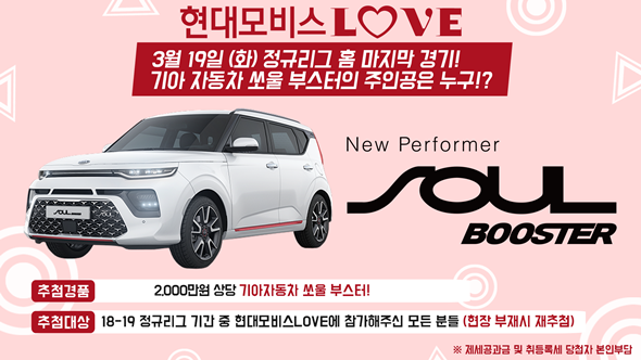 신형 쏘울부스터의 주인공은 ‘사랑의 바스켓’ 응모자 중에서 선정된다. 정규리그 마지막 홈경기를 포함한 모든 홈경기 중 한 번이라도 ‘사랑의 바스켓’에 참여했다면 누구나 신형 쏘울부스터의 주인공이 될 수 있다.