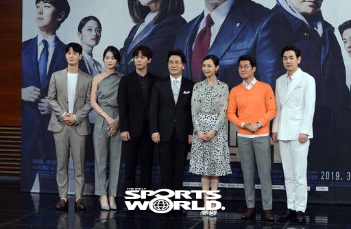 [스포츠월드 김두홍 기자] 배우 차인하, 신도현, 안우연, 유동근, 채시라, 김상중, 김태우(왼쪽부터)가 27일 상암MBC 골든마우스홀에서 열린 MBC수목드라마 '더뱅커' 제작발표회에서 포즈를 취하고 있다.
