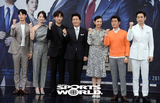 [스포츠월드 김두홍 기자] 배우 차인하, 신도현, 안우연, 유동근, 채시라, 김상중, 김태우(왼쪽부터)가 27일 상암MBC 골든마우스홀에서 열린 MBC수목드라마 '더뱅커' 제작발표회에서 포즈를 취하고 있다.
