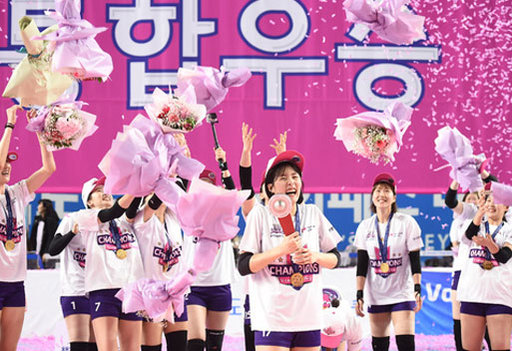 프로배구 흥국생명이 우승컵을 들어 올렸다. 27일 경북 김천체육관에서 치른 도로공사와의 ‘도드람 2018∼2019 V리그’ 여자부 챔피언결정전(5전3선승) 4차전에서 29점을 몰아치며 맹활약한 이재영을 앞세워 세트스코어 3-1(15-25 25-23 31-29 25-22)로 꺾었다. 이날 승리로 챔프전 전적 3승1패를 기록한 흥국생명은 마침내 우승컵을 들어 올렸다. 정규리그에서도 1위에 오른 흥국생명은 통합우승으로 화려한 시즌 피날레를 알렸다.