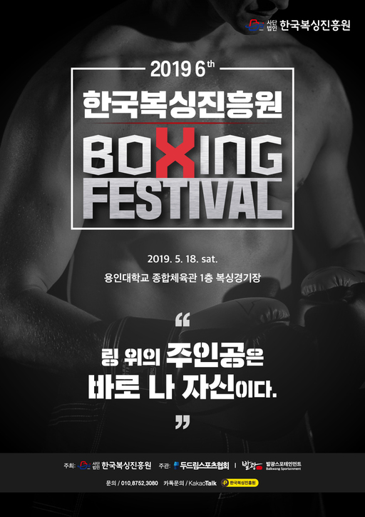 [스포츠월드=전영민 기자] 한국복싱진흥원이 주최하고, 용인대학교 격기지도학과, 두드림스포츠와 발광스포테인먼트가 주관하는 '2019 제6회 한국복싱진흥원 복싱페스티벌'이 오는 18일 용인대학교 종합체육관에서 열린다.