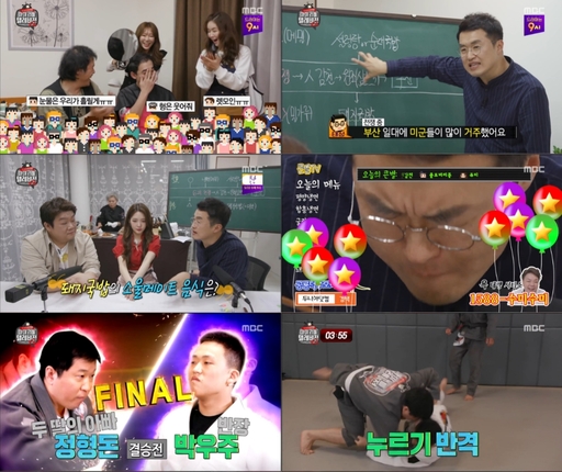 최태성 강사와 유민상, 노지선의 방에서는 전반전에 이어 쿡사(쿡방+역사)가 이어졌다. 후반전의 주제는 부산 음식이었다. ‘한식대첩’ 등에 출연했던 박경례 셰프가 출연한 가운데 최태성은 부산의 대표 음식인 밀면과 관련된 이야기를 전했다. 최태성 강사는 밀면에 대해 설명하다가 ‘개판 오 분 전’에 대해 언급했고, 이를 들은 박경례 셰프는 “제 별명이 민락동의 풀무치였다. 이단 옆차기가 특기”라고 카리스마 넘치는 대답으로 받아쳐 폭소를 자아냈다.