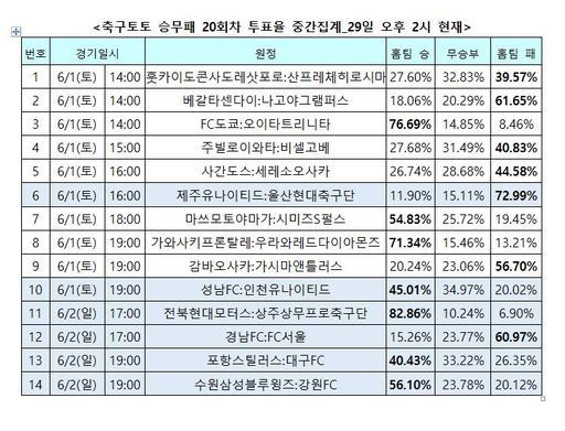 한편, 이번 승무패 20회차는 오는 6월 1일(토) 오후 1시50분에 발매를 마감하며, 경기가 모두 종료된 후에 결과가 공식 발표된다.