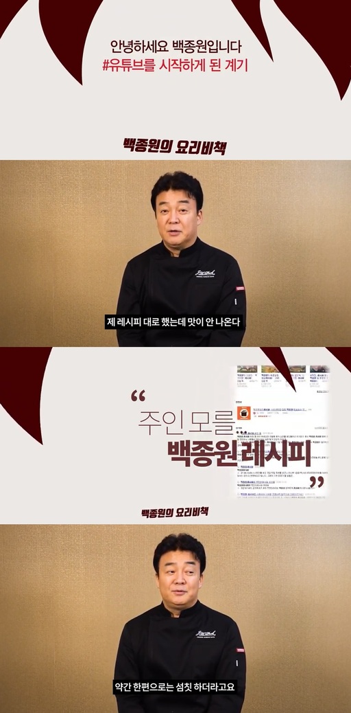 이어진 영상을 통해 “요리에 자신감을 주고 싶었다”고 말한 백종원은 앞으로 채널을 통해 공개될 레시피도 지금까지 조리서에 썼던, 혹은 방송에 노출된 레시피 그대로 쓸 거라고 밝혔다. “(내 레시피를) 맹신하지 말고 참고해서 쓰라”는 그는 음식은 간이 가장 중요하기 때문에 자신의 레시피를 기반으로 간을 조절하면서 자신만의 레시피를 찾으라고 당부했다.