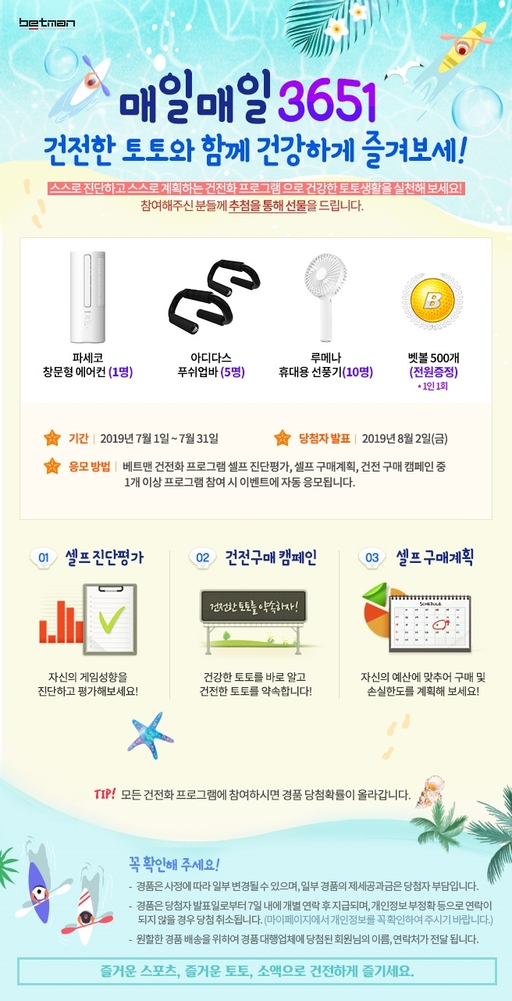 [스포츠월드=김진엽 기자] 체육진흥투표권 스포츠토토의 공식온라인 발매사이트인 베트맨이 7월 건전화 프로그램 이벤트인 ‘매일매일 3651 건전한 토토와 함께 건강하게 즐겨보세!’를 실시한다.
