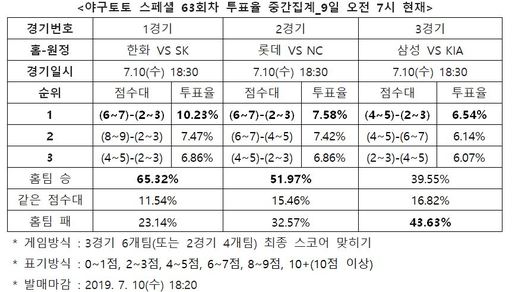 이번 야구토토 스페셜 63회차 게임은 경기 시작 10분 전인 오는 10일 오후 6시 20분 발매가 마감되며, 경기가 모두 종료된 후에 적중결과가 공식 발표된다.