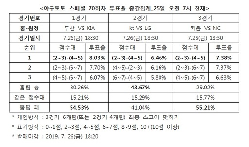 [스포츠월드=이혜진 기자] 체육진흥투표권 스포츠토토의 수탁사업자인 ㈜케이토토는 26일에 열리는 2019시즌 한국프로야구(KBO)프로야구 3경기를 대상으로 한 야구토토 스페셜 70회차 투표율을 중간 집계한 결과, kt-LG(1경기)전에서 승부를 알 수 없는 접전이 예고됐다고 밝혔다.