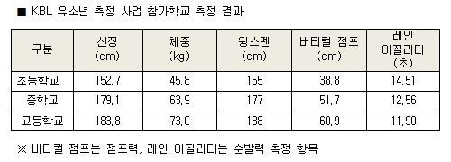 ‘KBL 유소년 측정 사업’은 7월 현재 초등학교 8개팀(24.2%), 중학교 8개팀, 고등학교 3개팀(10.0%)이 참가했다. KBL은 참가 선수들의 신장, 체중, 윙스펜 등 주요 신체 치수 및 체력을 측정했으며, 재활 및 부상 방지 교육과 기초 스킬 트레이닝도 함께 진행했다.
