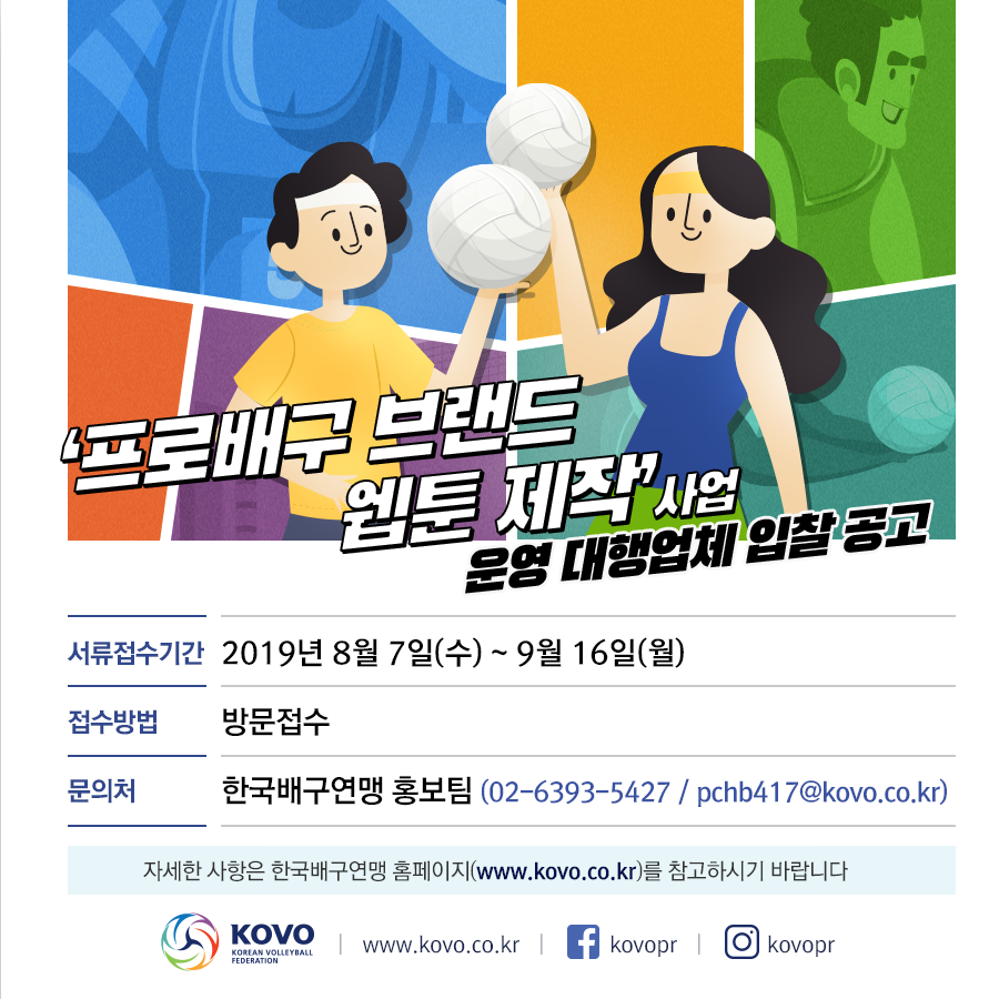 [스포츠월드=김진엽 기자] 한국배구연맹(이하 연맹)은 프로배구 홍보 강화를 위한 전략중 하나로 금번 시즌부터 추진되는 프로배구 브랜드 웹툰 제작의 대행업체를 모집한다.