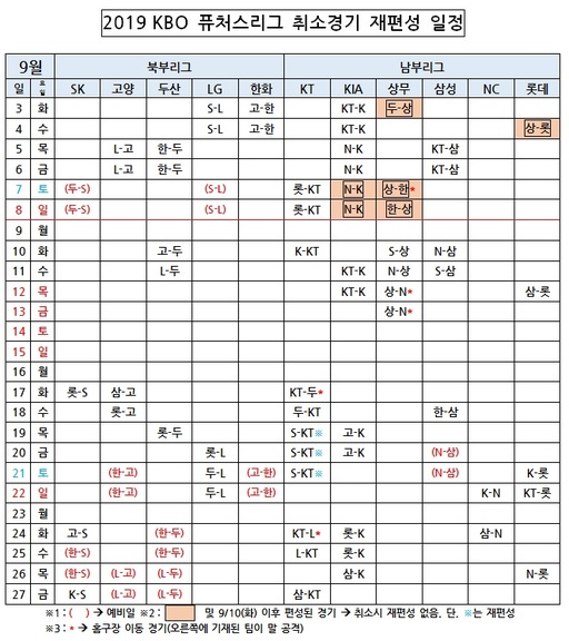 재편성된 경기는 9월 3일부터 8일까지 6경기, 10일부터 27일까지 37경기가 편성됐다. 기존에 편성되지 않았던 SK와 KT의 3경기는 9월 19일(목)부터 21일(토)까지 익산구장에서 개최된다.