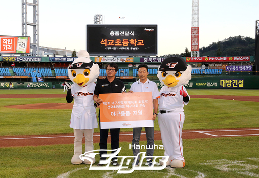 이상군 한화이글스 스카우트 총괄은 이 날 한화생명 이글스파크에서 열린 키움히어로즈와 홈경기에 앞서 그라운드에서 이희준 석교초등학교 야구부 감독에게 300만원 상당의 야구용품을 전달했다.