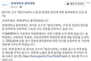 이와 관련해 연세대 총학생회는 ‘류석춘 교수 『발전사회학』수업 중 발생한 발언에 대한 총학생회의 긴급 공지’라는 제목의 글을 통해 류석춘 교수의 발언에 대한 심각성을 전하고 대응을 예고했다.