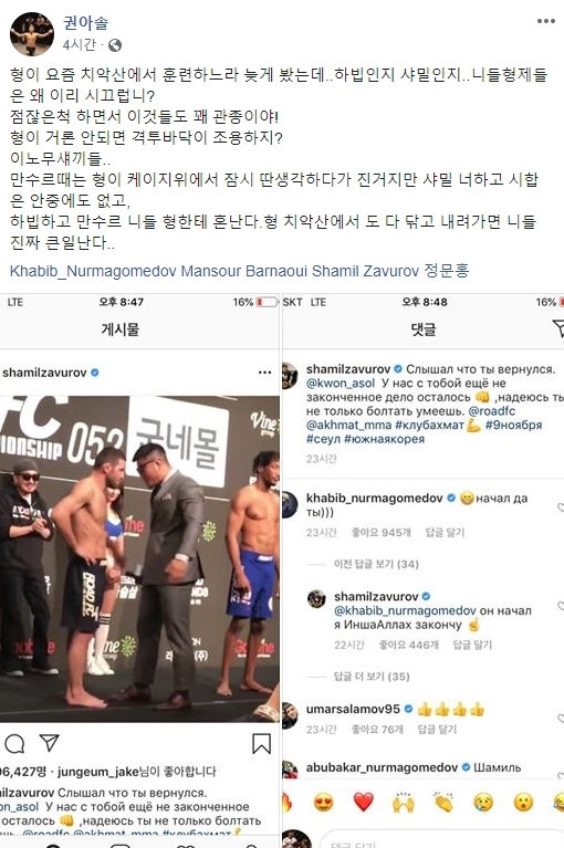 계속된 도발에 샤밀 자브로프는 권아솔의 후두부를 잡기도 했고, 이제 경기가 결정되자 SNS로 권아솔을 먼저 자극한 것이다. 샤밀 자브로프와 하빕 누르마고메도프의 SNS 언급에 권아솔도 반응했다.