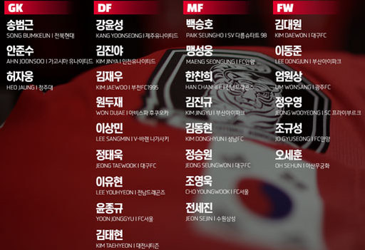 GK: 송범근(전북현대), 안준수(가고시마 유나이티드), 허자웅(청주대)