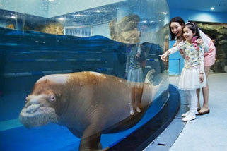 수십명의 아이들이 바다코끼리 ‘메리’를 찾는 목소리다. 한화아쿠아플라넷 일산에서는 하루에 4번, 이곳 마스코트 ‘메리’를 소개하는 바다코끼리 생태설명회를 갖는다. 600㎏에 이르는 메리는 커다란 덩치를 갖고 있지만, 애교 넘치는 개구쟁이다. 아이들이 부르면 헤엄쳐와 물대포를 쏘며 장난을 치기도 한다. 주특기는 동그란 ‘엔젤링’을 만드는 것.