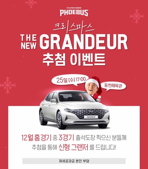 현대모비스가 2019년 마지막 홈경기에 현대자동차에서 출시한 ‘더 뉴 그랜저’ 추첨 이벤트를 진행한다. 더 뉴 그랜저는 6세대 그랜저의 페이스리프트 모델로 미래지향적 디자인과 신사양 적용으로 큰 인기를 끌고 있는 현대자동차의 대표 플래그십 세단이다. 현대모비스는 연말에 따뜻한 기운을 전하고 행운 가득한 새해를 기원하는 의미에서 이런 자동차 추첨 이벤트를 기획했다.