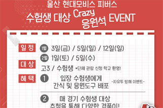현대모비스가 2020학년도 대학수학능력시험을 치른 수험생을 대상으로 ‘CRAZY 응원석’을 운영한다. CRAZY 응원석은 원정팀 골대 뒤 2층 좌석에 모여 앉아 특별히 준비된 응원도구로 현대모비스의 승리를 함께 응원하는 자리다. 울산지역 수험생들이 방학 동안 농구와 친숙해지는 계기를 만들기 위해 준비된 이벤트다.