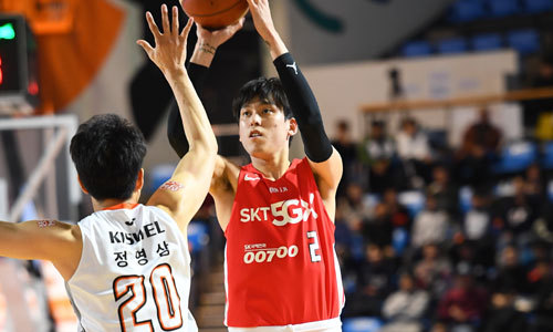 또 이겼다. 전자랜드만 만나면 펄펄 나는 SK다. 이번 시즌 전자랜드를 상대로 전승 행진을 이어가고 있다. 전반기 치른 세 번의 맞대결에서 모두 승리를 챙긴 데 이어 후반기에도 ‘천적’으로서의 위엄을 과시했다. 22일 잠실학생체육관에서 열린 전자랜드와의 ‘2019~2020 현대모비스 프로농구’ 4라운드 경기에서 72-60(19-21 26-8 19-14 8-17)으로 승리했다. 시즌 22승(12패)째를 올린 SK는 한 경기 덜 치른 인삼공사(21승12패)를 따돌리고 단독 1위로 올라섰다.